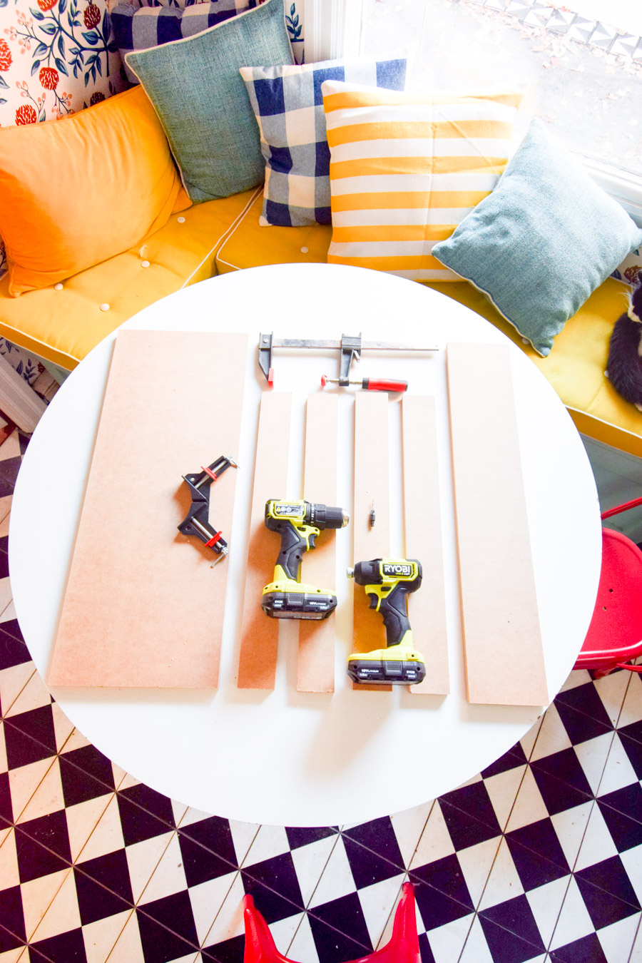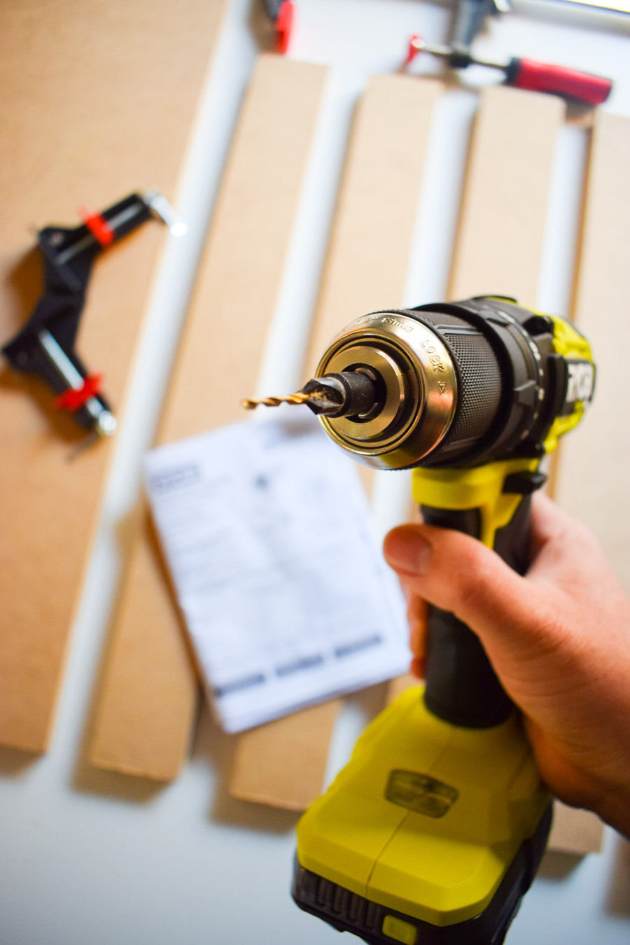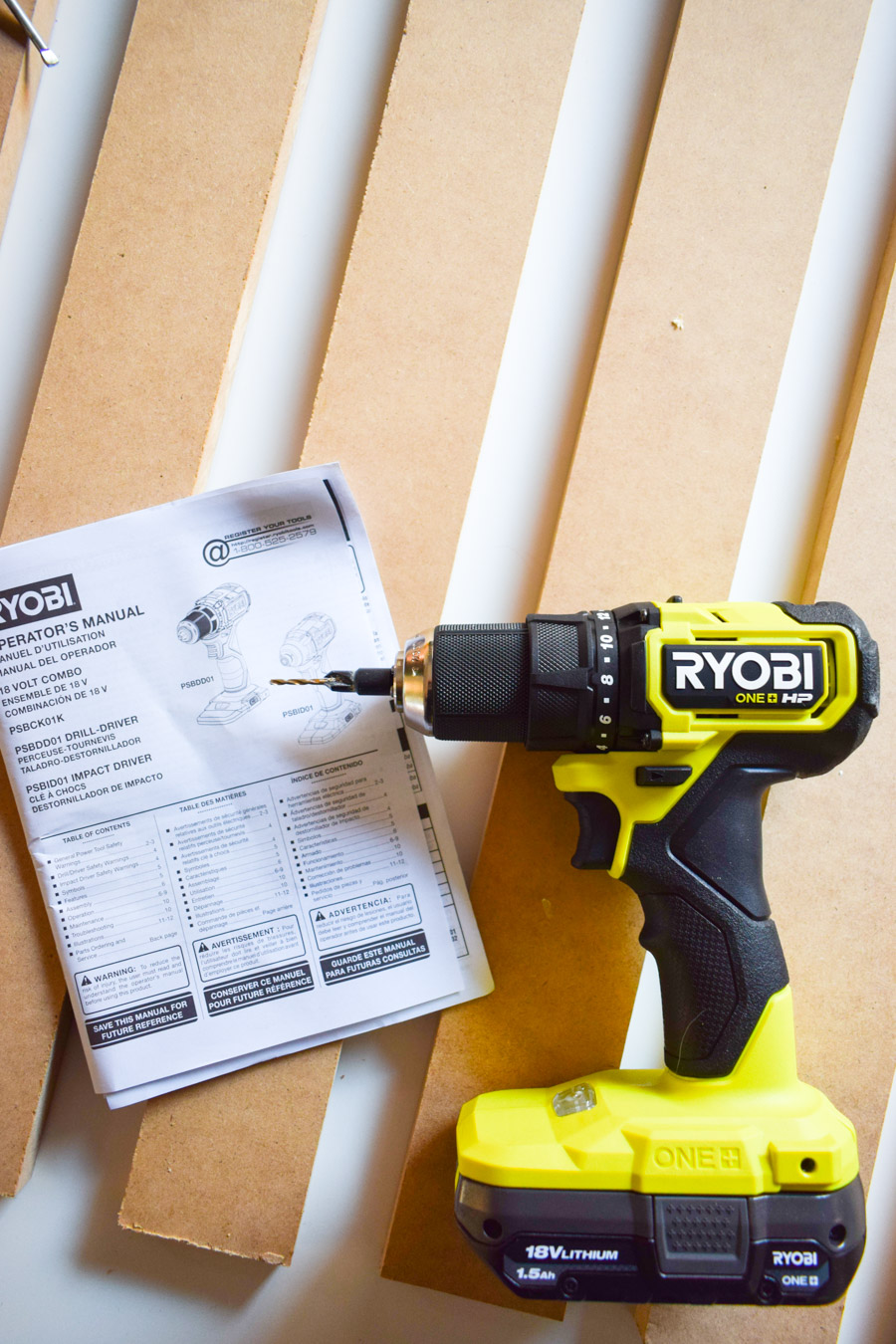 I also used 90* clamps, a regular clamp, wood glue, wood screws, and the Ryobi 18V One+ HP Compact Brushless Drill + Impact Combo Kit. They’ve got a whole compact set of tools (launched this summer) and if you’re in the market for something smaller but equally powerful, this range is for you.