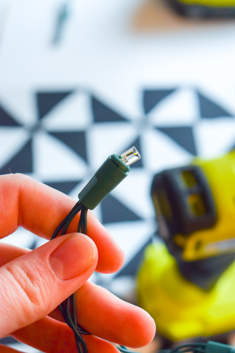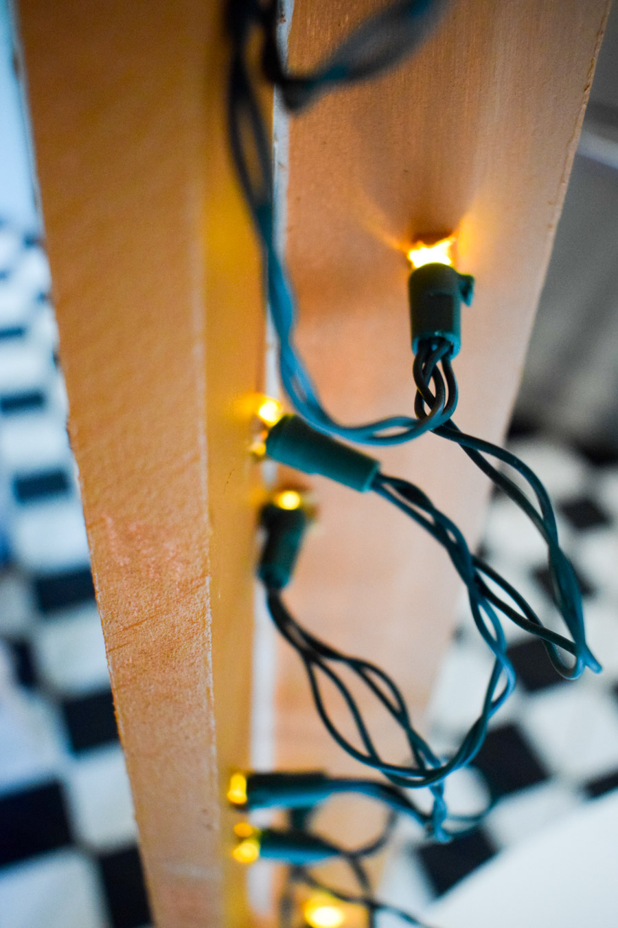 I wanted to make something top notch, so I knew we needed to talk about a lighting scheme. I used some small battery operated lights that I had from another project, and drilled random holes into the pillars.