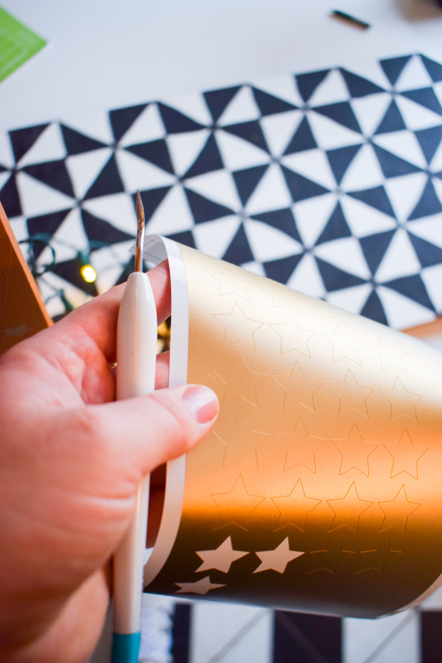 My original plan was to paint gold stars around each light hole, so that it would look like shimmering stars around the stage. But I decided that vinyl stars would do the trick.