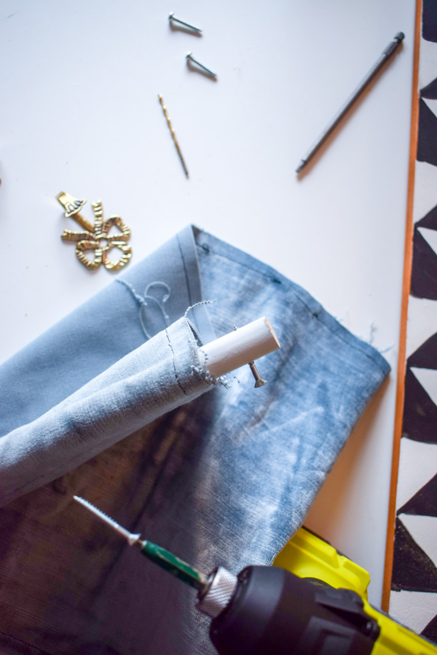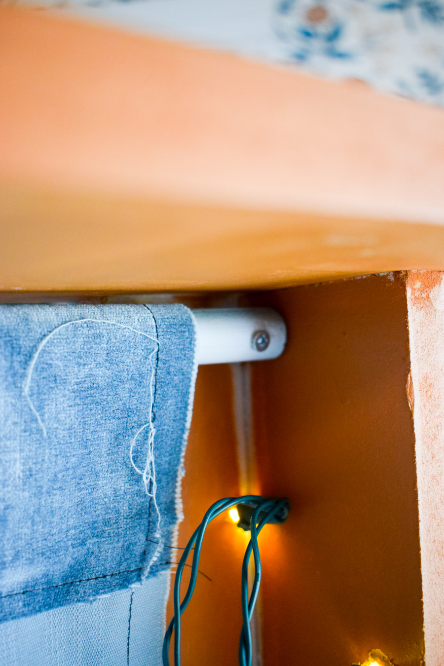 I sewed two small curtain panels from leftover velvet, and using a dowel and the Ryobi brushless combo, added it to the puppet theater.